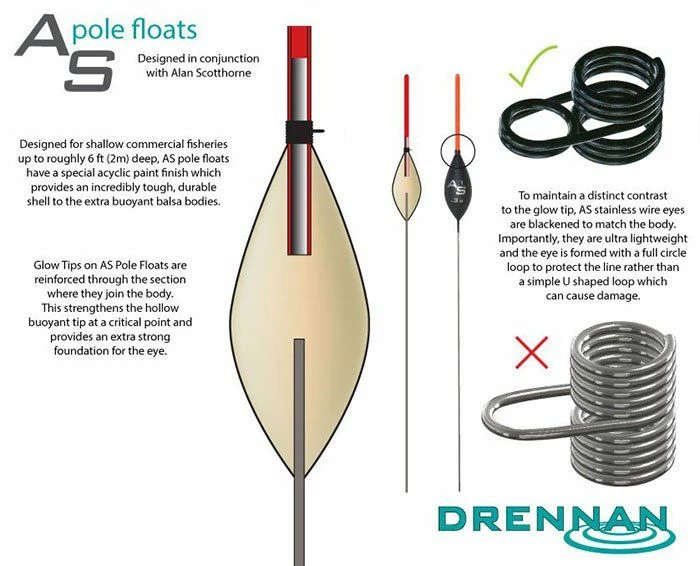 Designed and developed with 5 times World Champion Alan Scotthorne, Drennan’s AS3 pattern features hollow glow tips, a super strong surface finish and improved wire eyes. With a slim, streamlined body shape and sensitive, hollow glow tip at just 1.25mm diameter. The AS3 is the ideal float for silverfish, F1’s and small carp. Available in sizes ranging from 0.1g to 0.6g.