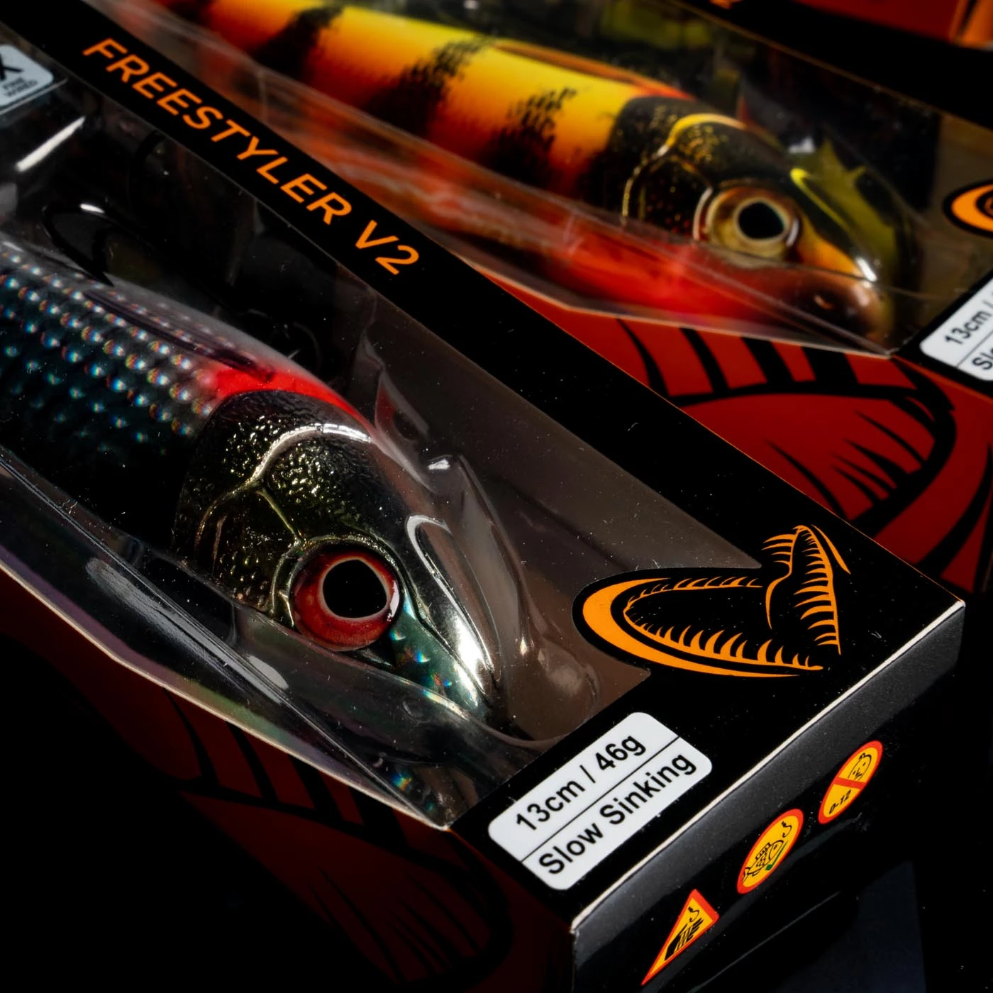 Updated and improved versions of the popular Savage Freestyler Lures. The V2 edition has a slow sinking action and is critically balanced to give that all important pause and hang before slowly dropping. Ideally worked back like a jerk of twitch bait and with a highly reflective realistic pattern that makes the most of the available sunlight. A lure that proved effective for pIke, zander and perch in fresh water as well as bass and pollack in saltwater.